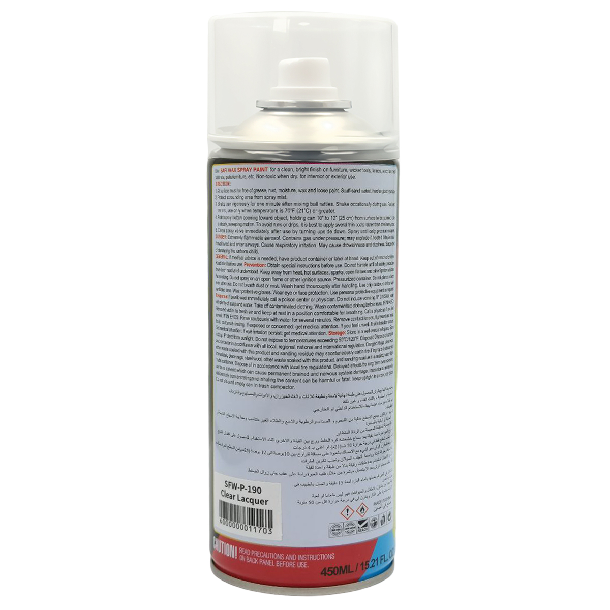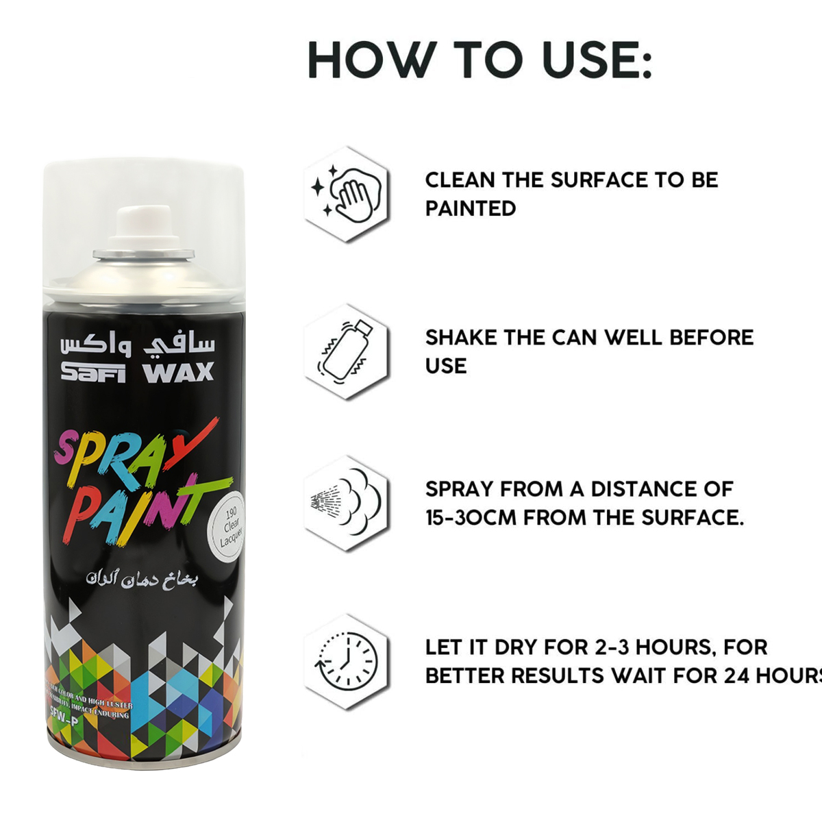 SAFI WAX Spray Paint 450ML (SFW-P) is a high-quality clear lacquer aerosol that delivers a smooth, ultra-gloss finish on metal, wood, plastic, glass, and more. Its quick-drying formula ensures easy application with even coverage, while providing durable protection against scratches, rust, moisture, and UV damage. Ideal for automotive, DIY, and industrial use, this spray offers long-lasting shine and professional results in a convenient 450ML can.